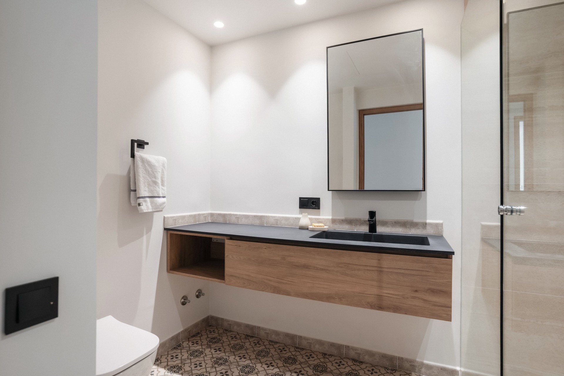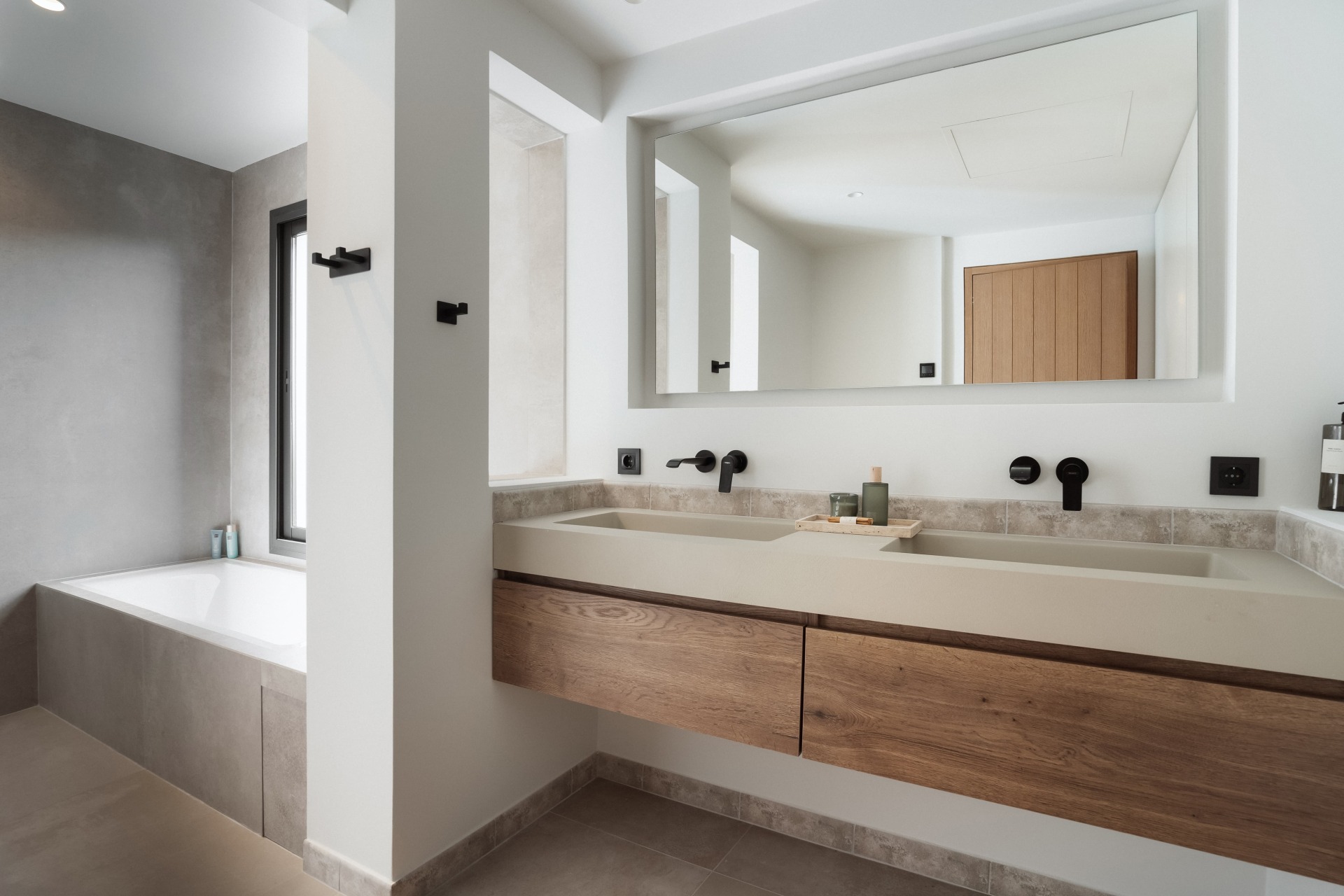 La suite parentale, située à l’étage supérieur, offre un havre de paix et d’intimité, avec un dressing, une salle de bains raffinée avec baignoire et douche, et sa propre terrasse. Le solarium sur le toit offre une vue panoramique sur la vallée du golf, avec un aperçu de la mer Méditerranée, un cadre idéal pour les couchers de soleil et les réunions détendues.