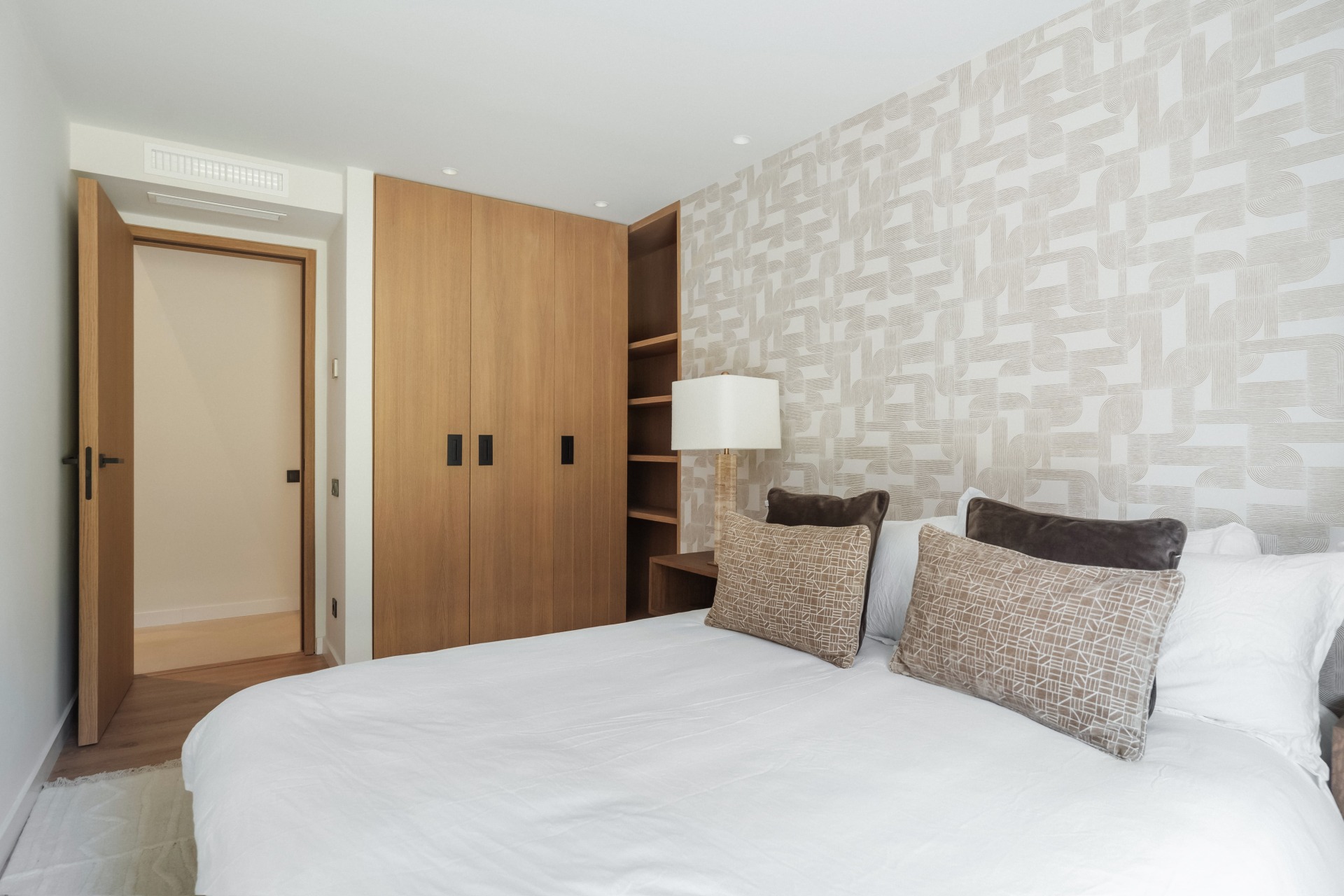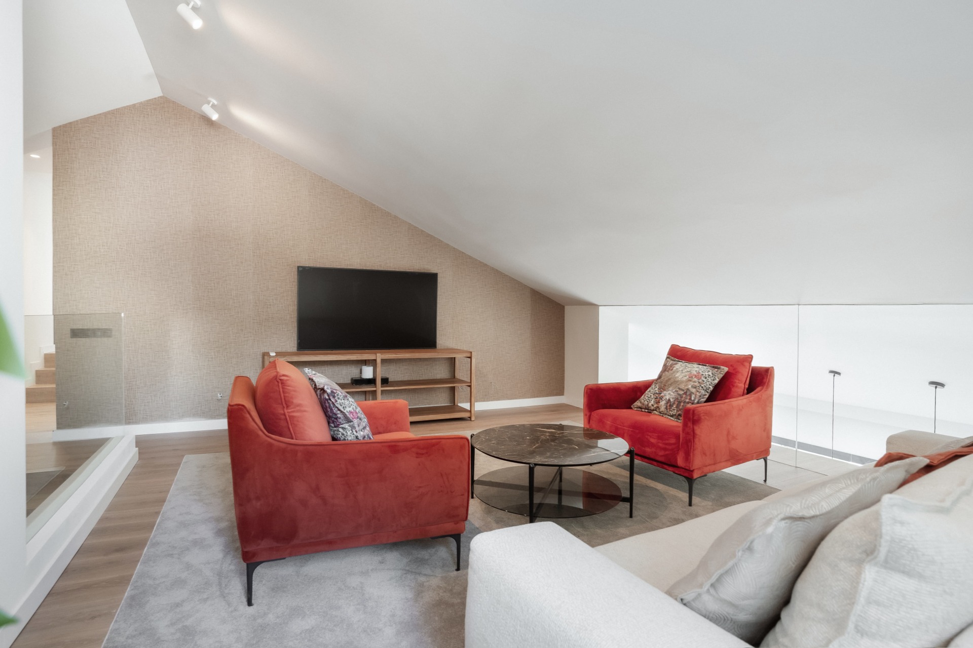 L’espace de vie principal est doté de hauts plafonds, de baies vitrées et de parquet en bois naturel, créant une atmosphère calme et accueillante. L’agencement ouvert s’intègre parfaitement à une cuisine contemporaine équipée d’appareils électroménagers Miele et de plans de travail en marbre, alliant à la perfection design et fonctionnalité.