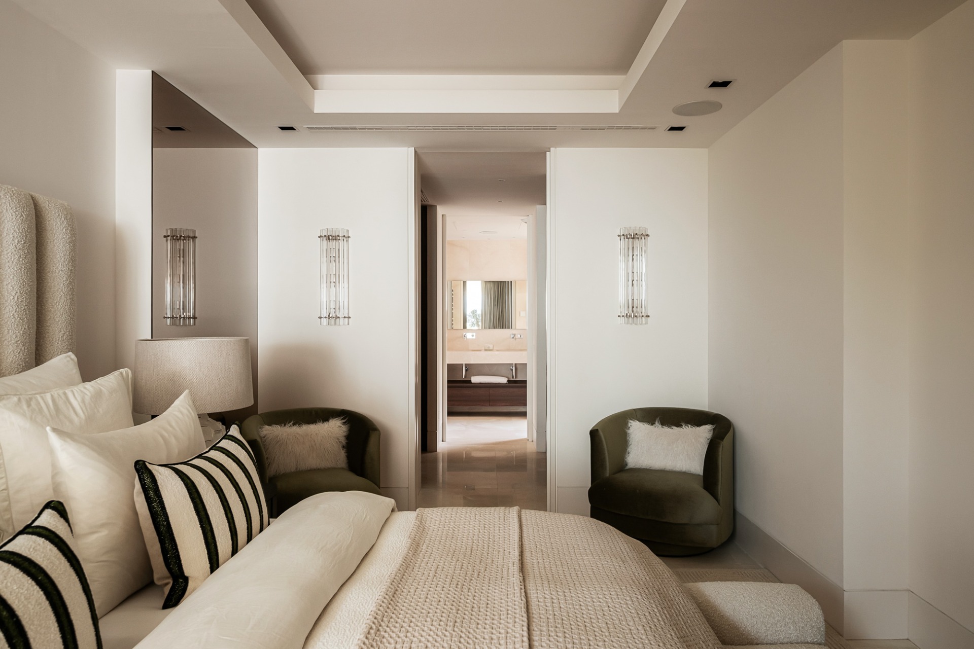 The private wing comprises a luxurious master suite with a walk-in wardrobe and en-suite bathroom, along with two additional en-suite bedrooms overlooking beautifully landscaped surroundings. A separate laundry room adds everyday convenience.