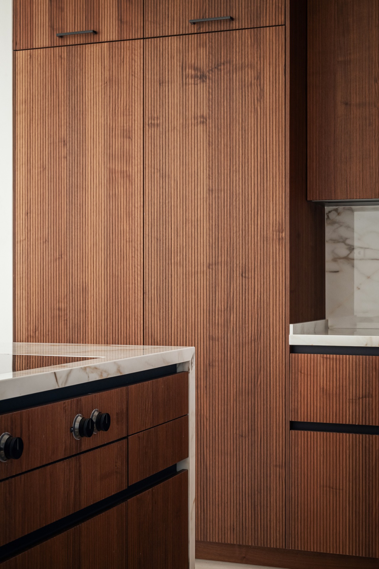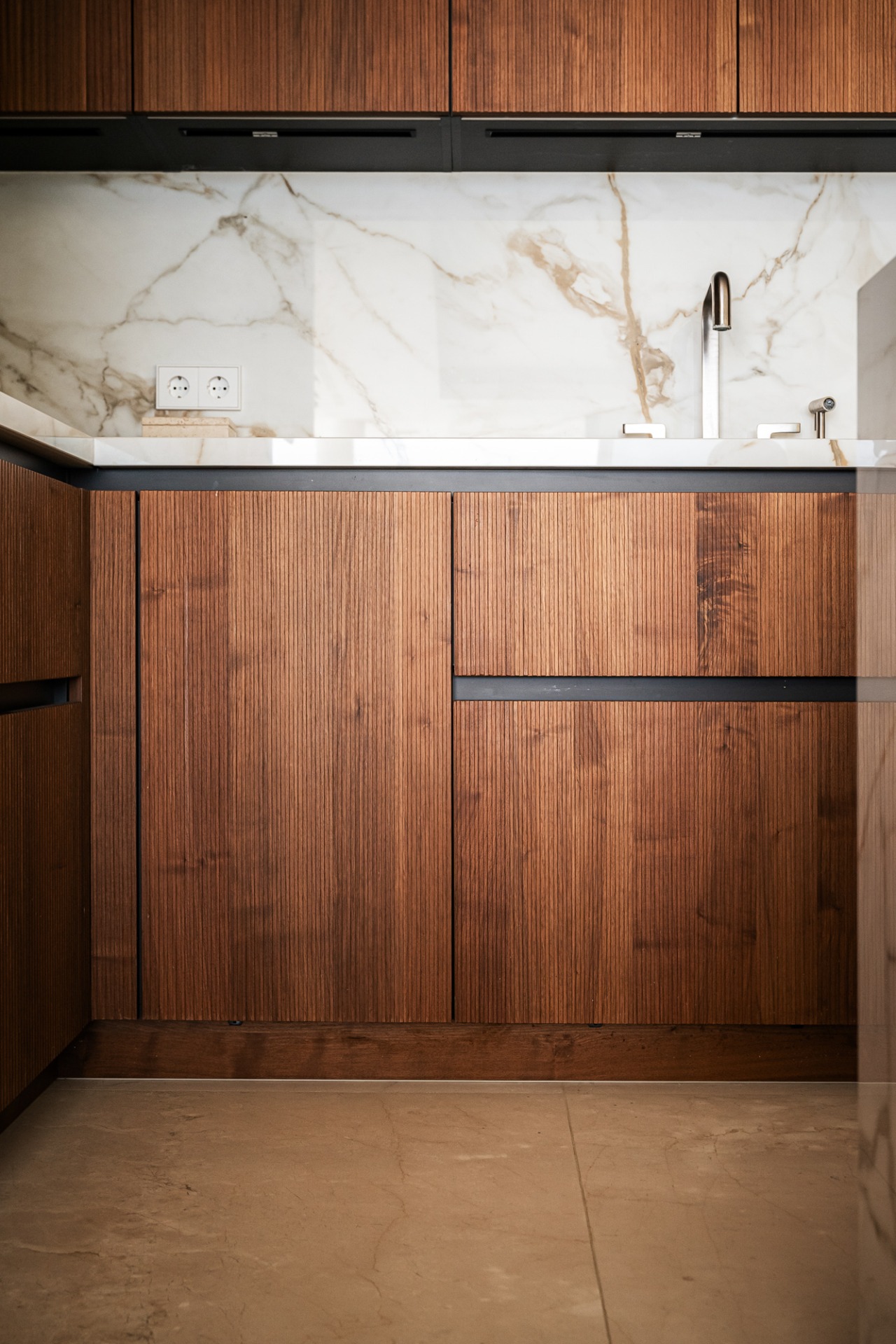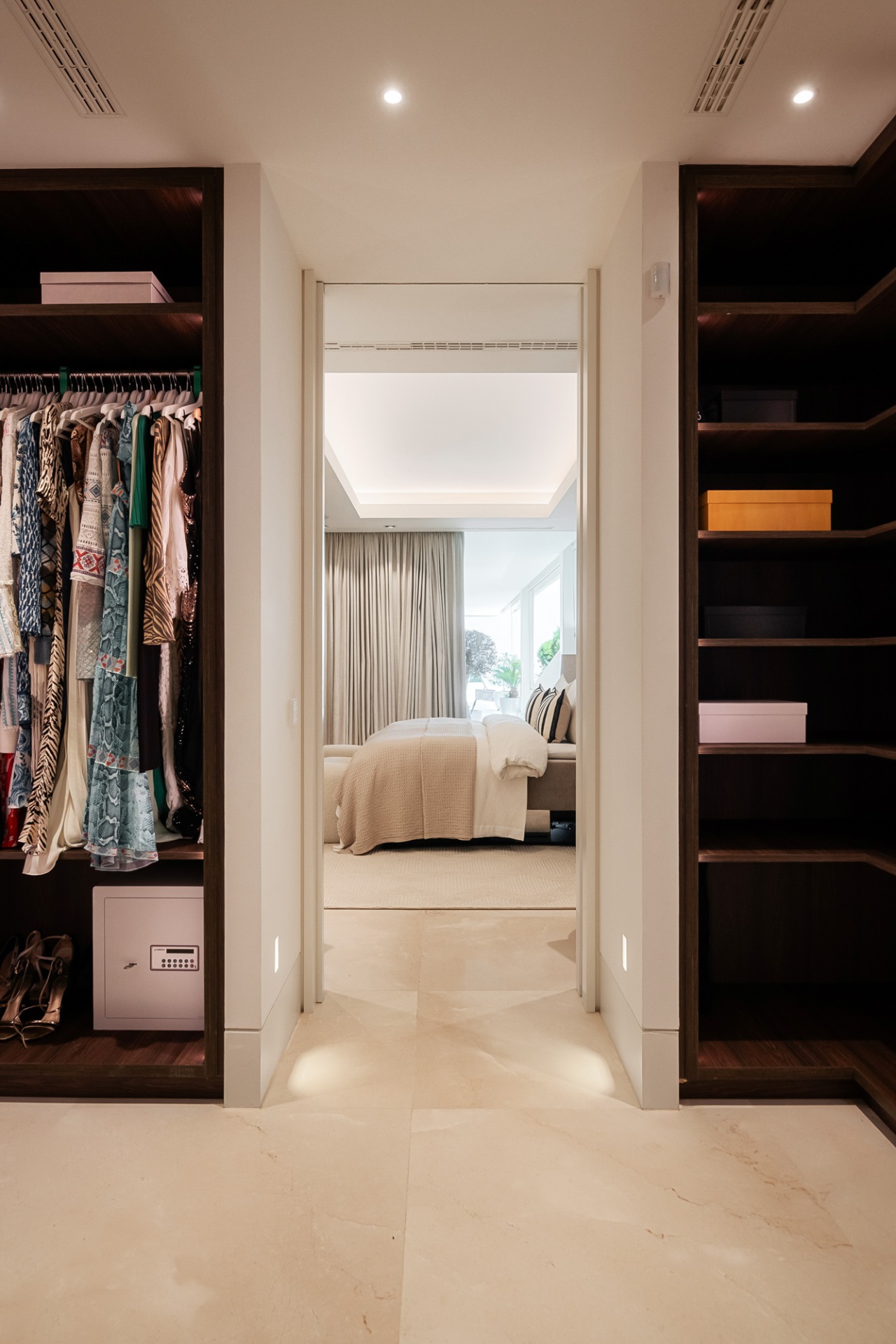 The layout has been thoughtfully designed, with a central hallway separating the living and sleeping areas. The open-plan living space features a designer kitchen fitted with Gaggenau and Miele appliances, complemented by a striking floor-to-ceiling wine display. Fully automated windows retract seamlessly, creating a perfect indoor-outdoor flow.